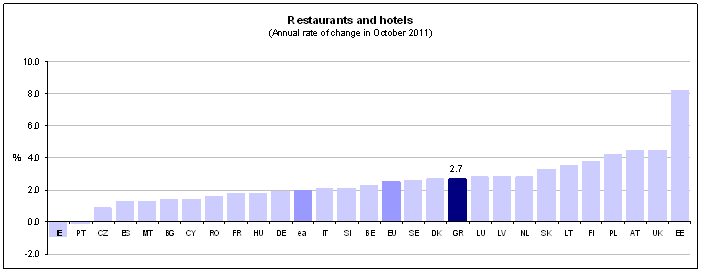 -ο στρατηγικός για τη χώρα μας τομέας της εστίασης και των ξενοδοχείων σημείωσε αύξηση 2,7% «χαρίζοντας» στην Ελλάδα το αρνητικό προβάδισμα στην ακρίβεια σε σύγκριση μάλιστα με ανταγωνιστικούς τουριστικούς προορισμούς.