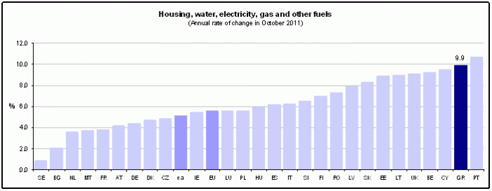 –η επιβάρυνση για στέγαση, νερό, ηλεκτρικό ρεύμα και καύσιμα ανήλθε στο 9,9% καταλαμβάνοντας τη δεύτερη θέση στην Ευρώπη (χωρίς να έχουν συνυπολογιστεί οι νέες αυξήσεις φωτιά στα τιμολόγια της ΔΕΗ)